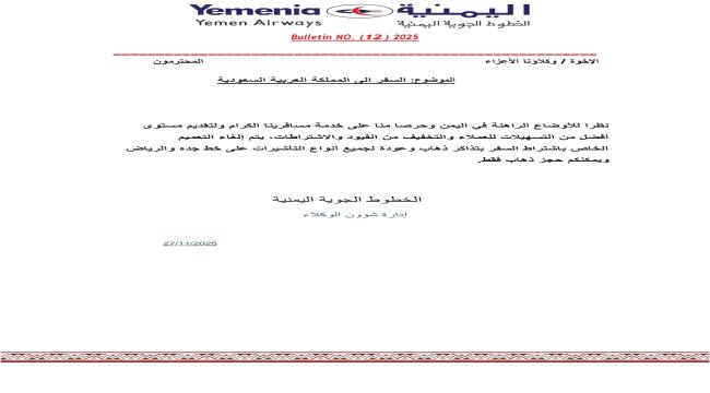 في إعلان رسمي من الخطوط الجوية اليمنية بخصوص السفر إلى المملكة العربية السعودية قالت فيه : حرصاً على راحة المسافرين وتقديم أفضل الخدمات ، تعلن اليمنية