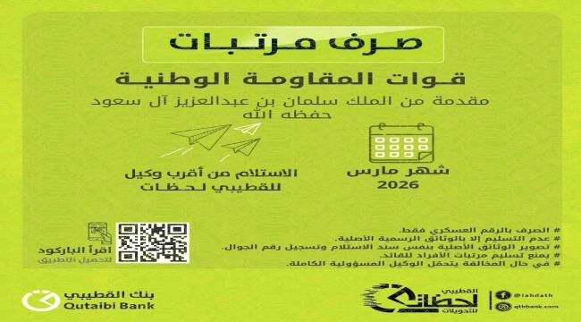 أعلن بنك القطيبي الإسلامي بدء صرف مرتبات قوات المقاومة الوطنية، وقوات النخبة الحضرمية والأمن بساحل حضرموت لشهر مارس 2026، بدعم كريم من خادم الحرمين ال