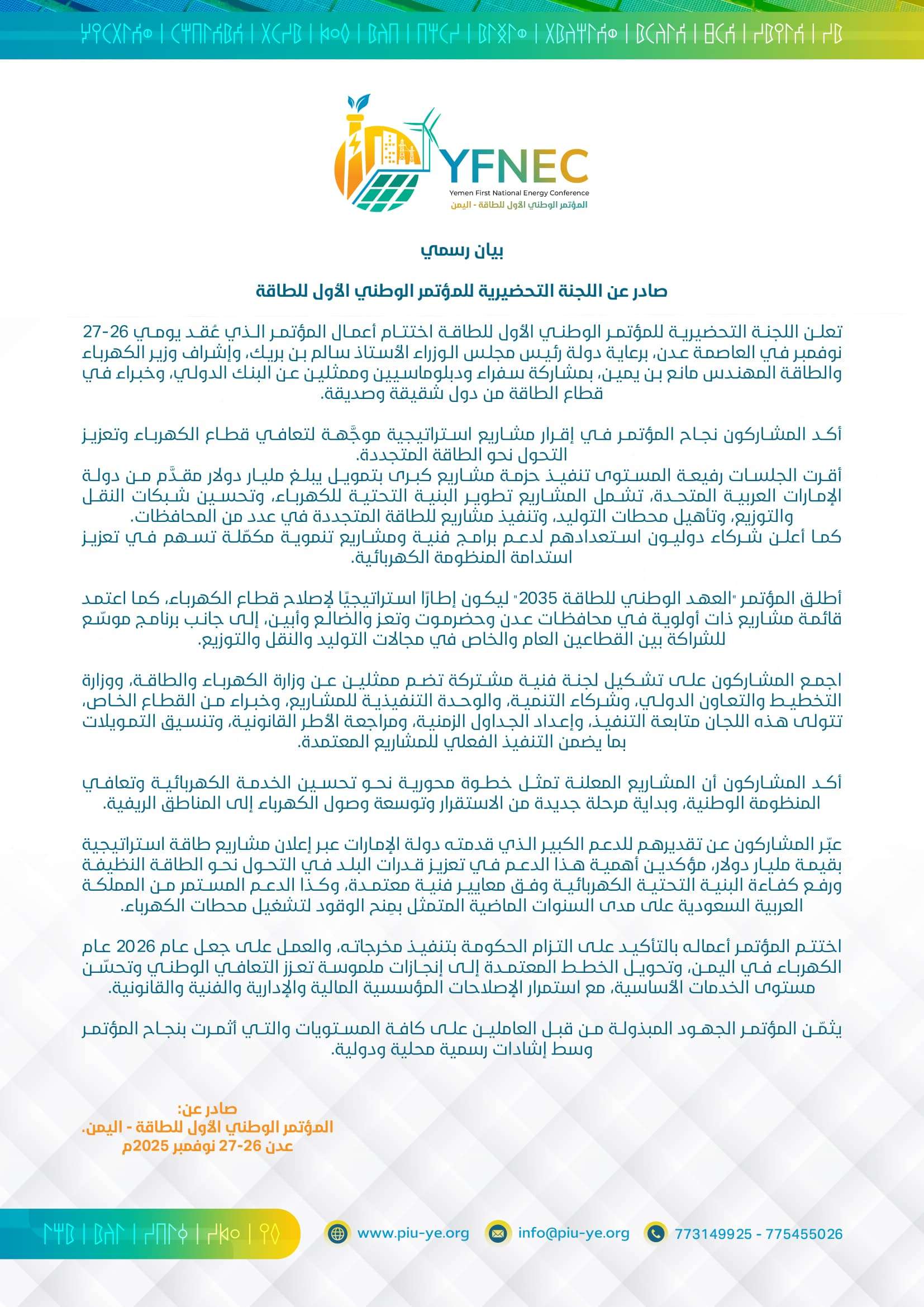تعلن اللجنة التحضيرية للمؤتمر الوطني الأول للطاقة اختتام أعمال المؤتمر الذي عُقد يومي 26-27 نوفمبر في العاصمة عدن، برعاية دولة رئيس مجلس الوزراء الأستاذ سالم بن بريك، وإشراف وزير الكهرباء والطاقة المه...