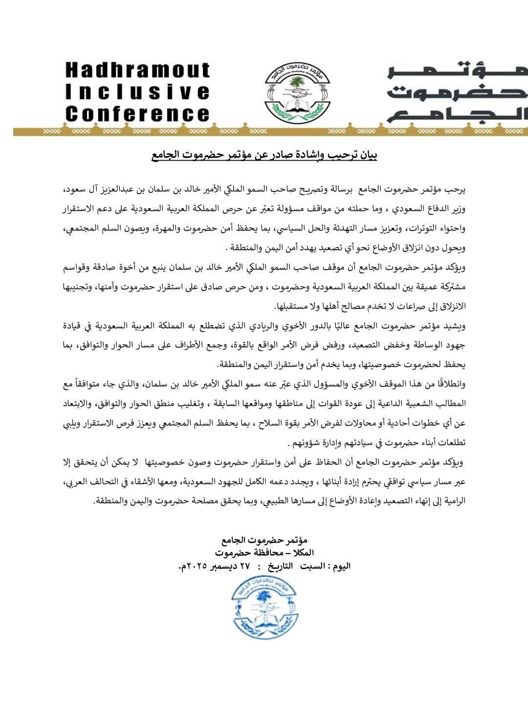 يرحب مؤتمر حضرموت الجامع برسالة وتصريح صاحب السمو الملكي الأمير خالد بن سلمان بن عبدالعزيز آل سعود، وزير الدفاع السعودي ، وما حملته من مواقف مسؤولة تعبّر عن حرص المملكة العربية السعودية على دعم...