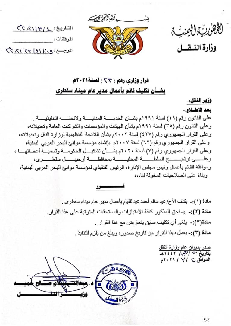 ورد الان : صدور اول قرار للحكومة اليمنية يتعلق بمحافظة سقطرة بعد سيطرة الانتقالي عليها ...صورة القرار