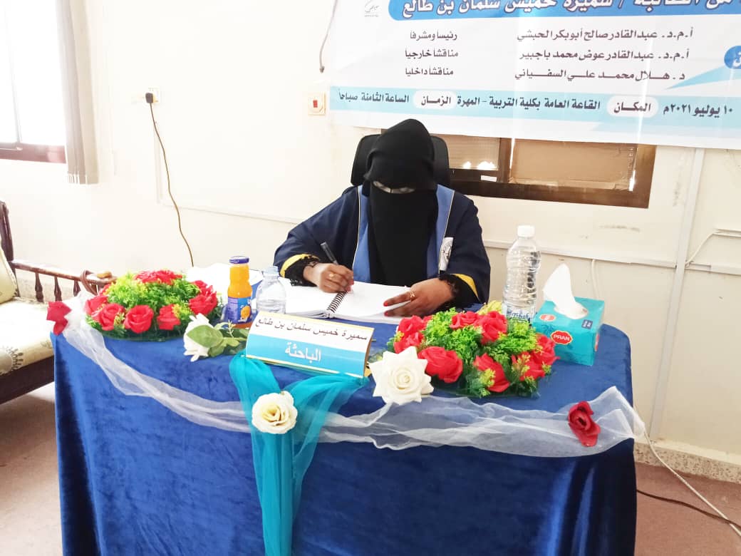الباحثة سميرة خميس تنال درجة الماجستير الموسومة بعنوان الصعوبات التدريسية بمراكز محو الامية وتعليم الكبار وسبل معالجتها من وجهة نظر معلمي محافظة المهرة.