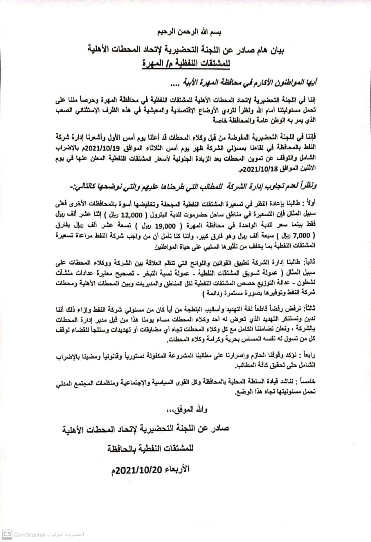 بيان صادر عن اللجنة التحضيرية لإتحاد المحطات الأهلية للمشتقات النفطية في المهرة