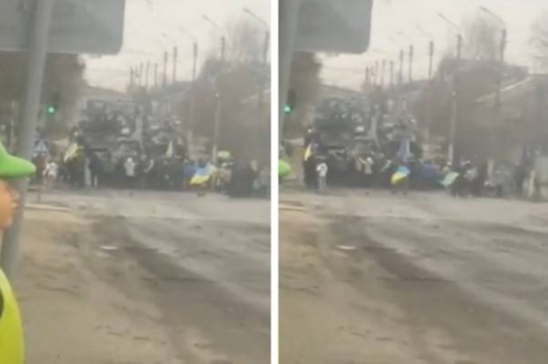 شاهد.. أوكرانيون يعترضون رتلاً عسكرياً روسياً في مدينة لوهانسك