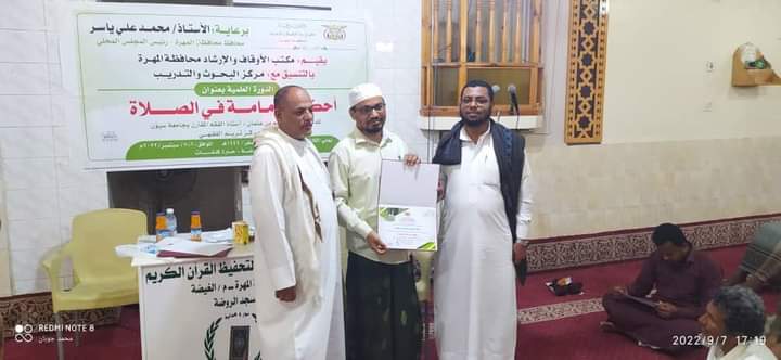 مكتب الأوقاف و الإرشاد بالمهرة يختم دورة تدريبية بعنوان احكام الإمامة في الصلاة