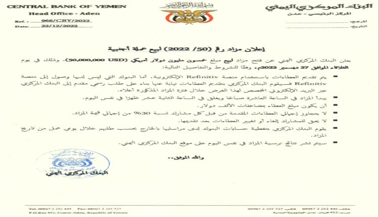 البنك المركزي اليمني يرفع قيمة المزادات لبيع عملة نقدية
