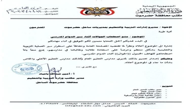 منع الطلاب من اصطحاب جوالاتم اثناء الدوام المدرسي بساحل حضرموت