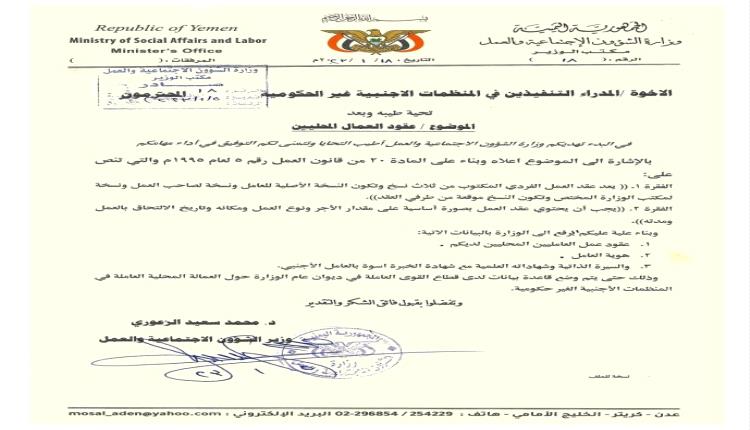 وثيقة - تعميم هام من وزارة الشؤون الاجتماعية للمنظمات الأجنبية الغير حكومية