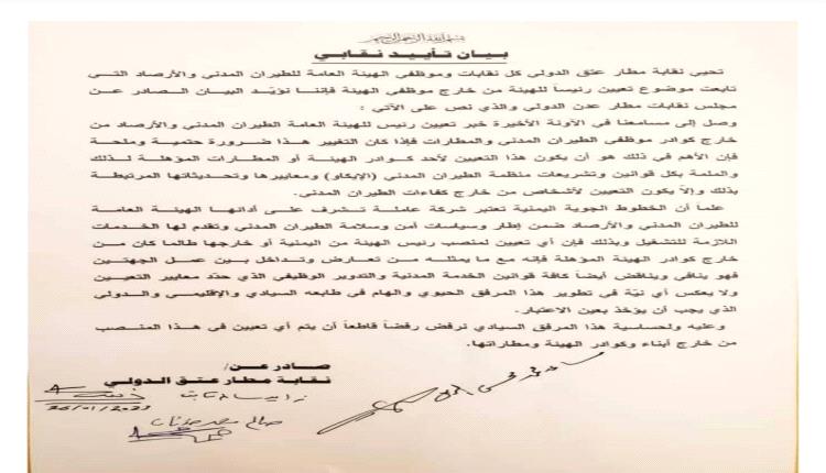 نقابة مطار عتق الدولي تعبر عن رفضها تغيير رئيس هيئة الطيران بآخر من غير كوادرها