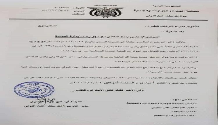 تعميم هام من سلطة جوازات مطار عدن الدولي