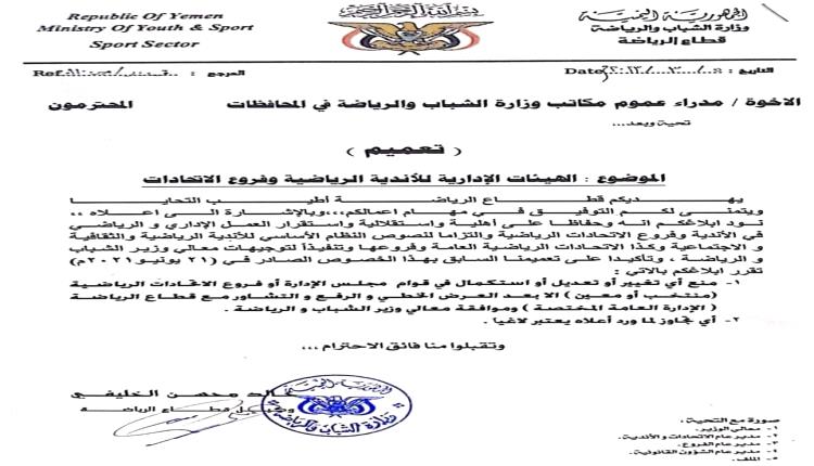 قطاع الرياضة في وزارة الشباب والرياضة يصدر تعميم بخصوص الهيئات الإدارية للأندية وفروع الاتحادات