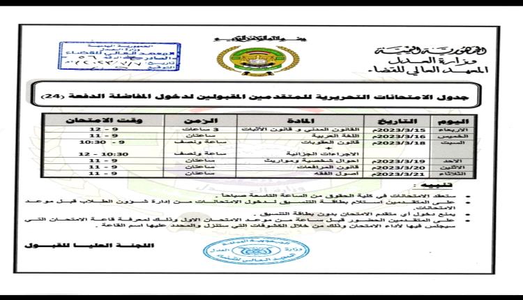 عدن تايم تنشر جدول ومقرر امتحانات القبول للدفعة 24 في المعهد العالي للقضاء