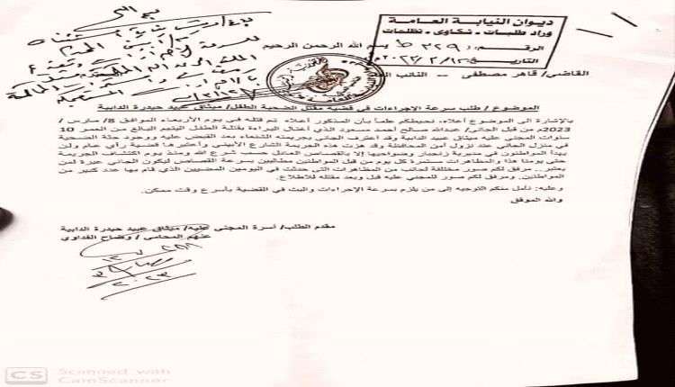 وثيقة - أول توجيه من النائب العام بشأن قضية مقتل الطفل ميثاق بأبين