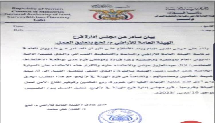 بيان - تعليق العمل في هيئة الأراضي بمحافظة لحج
