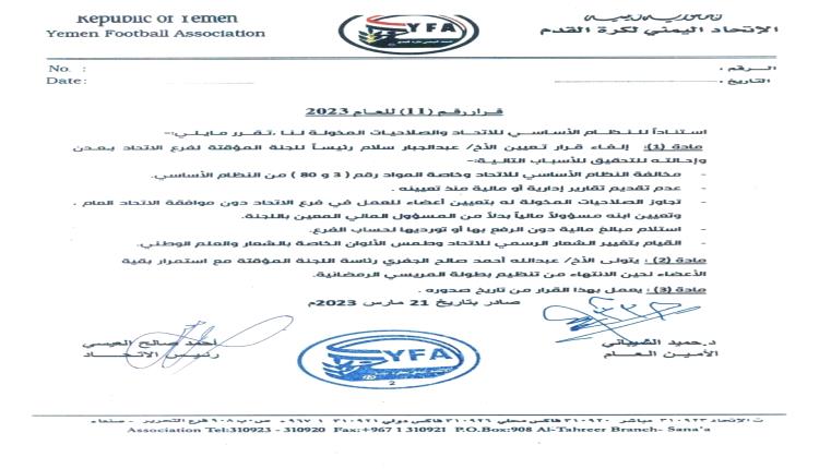 قرار اتحادي بإقالة عبدالجبار سلام من رئاسة مؤقتة اتحاد عدن وإحالته للتحقيق وتكليف عبدالله الجفري برئاستها
