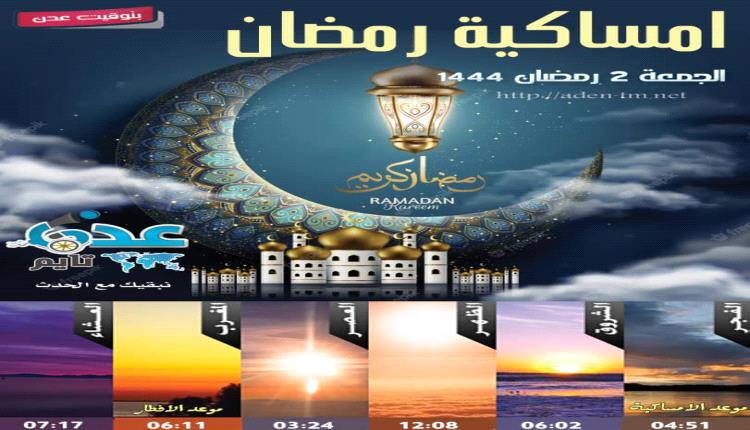 توقيت الامساكية والأفطار وأوقات الصلاة في العاصمة عدن ثاني أيام شهر رمضان