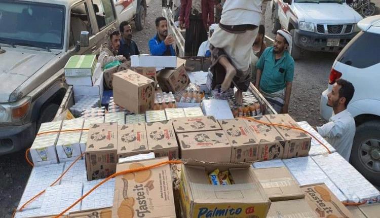 اهالي الحصين يسيرون قافلة غذائية دعماً للمرابطين في جبهة حجر الضالع