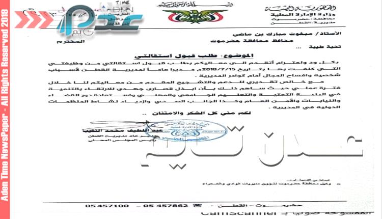 قيادي محلي بحضرموت يقدم إستقالة مسببة
