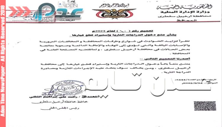 سقطرى تحظر دخول الدراجات النارية واستيراد قطع غيارها
