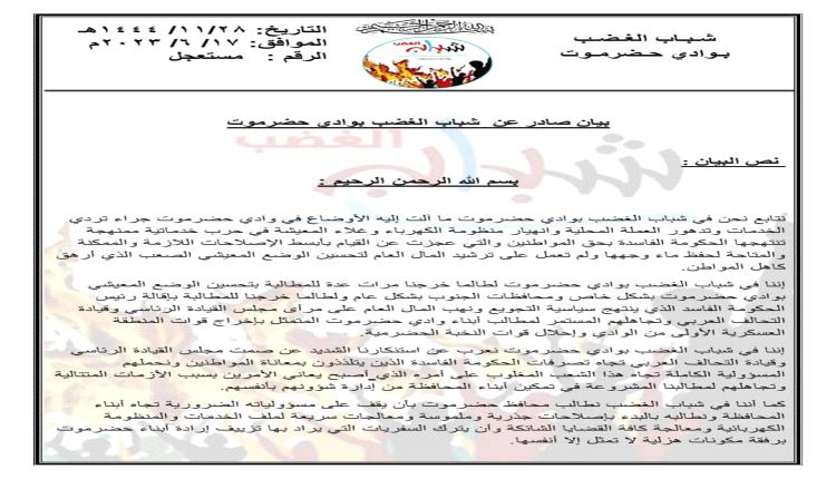 بيان صادر عن شباب الغضب بوادي حضرموت