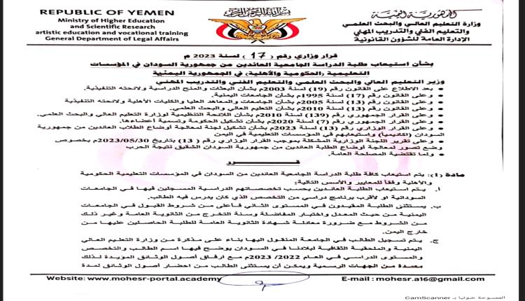 قرارين وزاريين لمعالجة أوضاع الطلاب العائدين من السودان (وثائق)