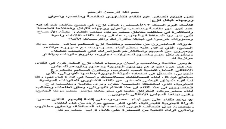 عدن تايم تنشر النص الكامل لبيان اللقاء التشاوري لمقادمة ومناصب وأعيان ووجهاء قبائل نوّح بحضرموت