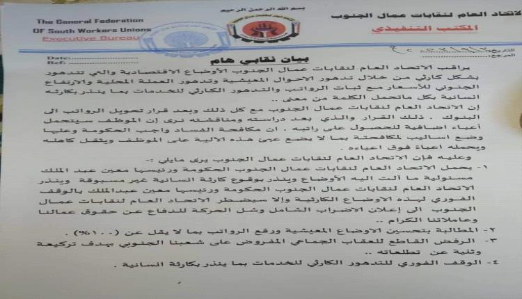 بيان صادر عن الاتحاد العام لنقابات عمال الجنوب