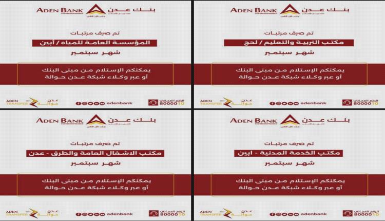 بنك عدن يبدأ تسليم مرتبات موظفي عدد من المرافق الحكومية في عدن ولحج وأبين