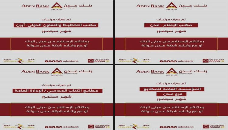 صرف مرتبات مرافق حكومية في محافظتي عدن وأبين عبر بنك عدن