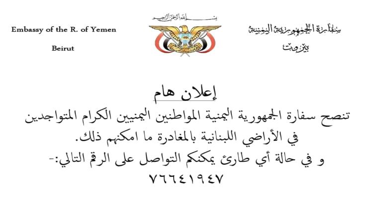 سفارة اليمن في بيروت تنصح الرعايا مغادرة الاراضي اللبنانية