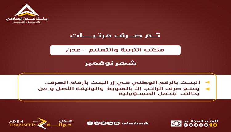 صرف مرتبات التربية والتعليم عدن لشهر نوفمبر عبر بنك عدن الإسلامي