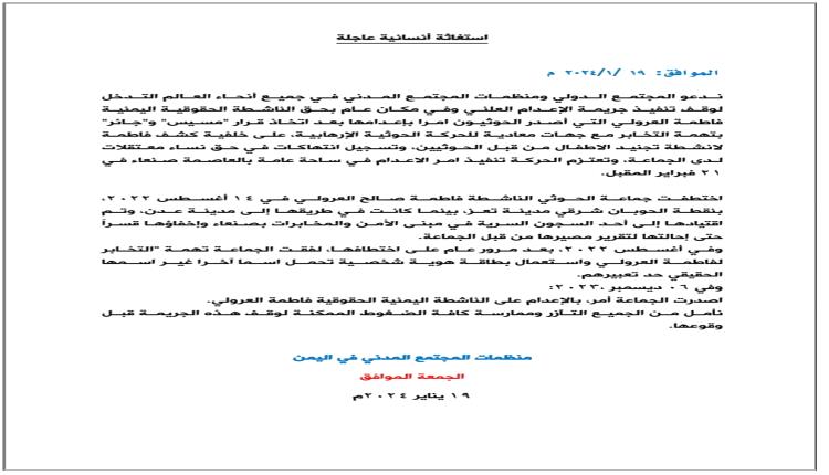 122 من منظمات المجتمع المدني في اليمن :  أوقفوا جريمة الحوثيين بإعدام الناشطة العرولي