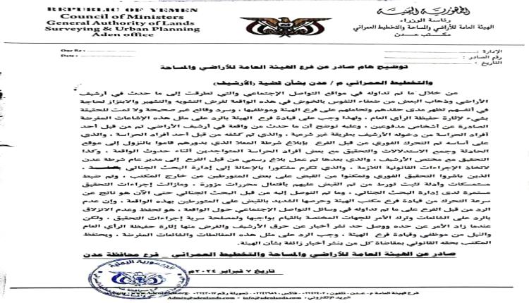 توضيح من هيئة الأراضي في عدن بشأن قضية (الأرشيف)