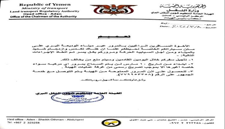 تعميمات صارمة بوقف السفر بالسيارات الخاصة والحافلات عبر منفذ الوديعة