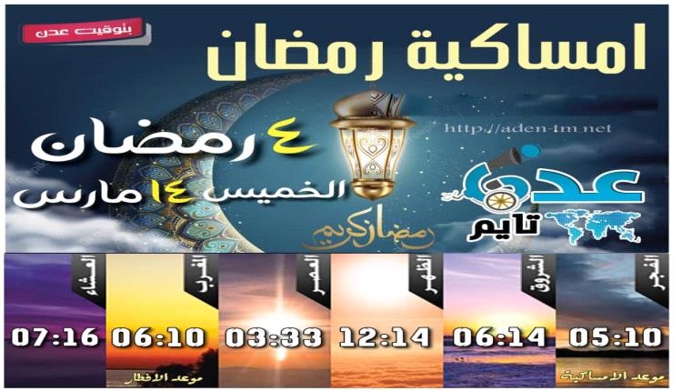 توقيت الإمساكية والافطار في العاصمة عدن يوم 4رمضان