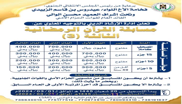 برعاية الرئيس الزُبيدي.. استمرار التسجيل في المسابقة الثالثة لحفظ القرآن الكريم وترتيله