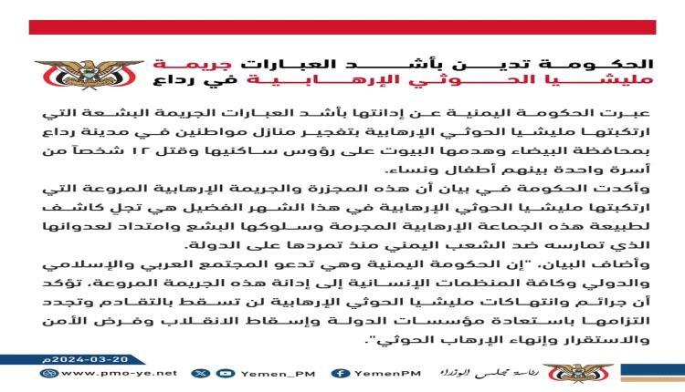 بماذا علقت الحكومة اليمنية على جريمة الحوثيين في البيضاء؟