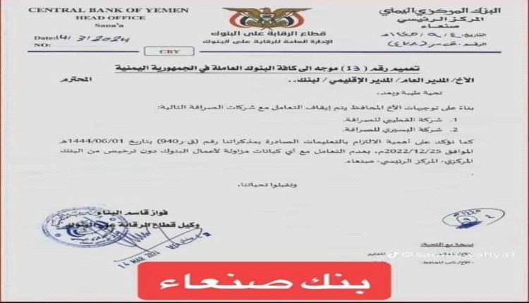 البنك المركزي الواقع تحت سيطرة مليشيا الحوثي يعلن عن إيقاف التعامل مع شركتي صرافة في الجنوب