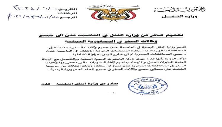 تعميم هام وعاجل عن وزارةالنقل إلى جميع وكالات السفر في الجمهورية اليمنية