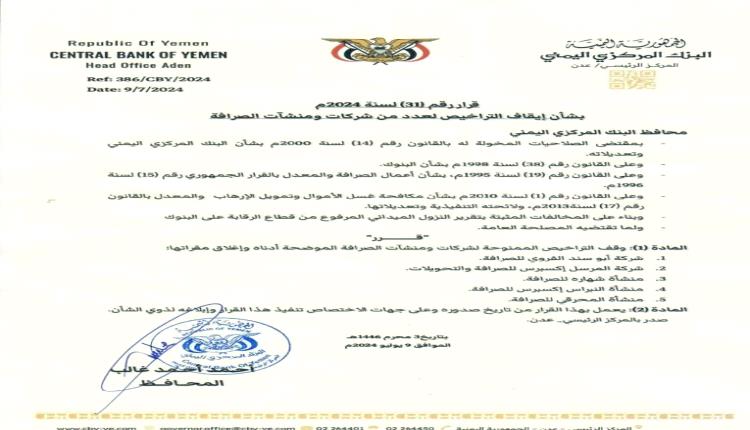 عاجل / البنك المركزي يصدر قرار بإيقاف 5 شركات صرافة (وثيقة)