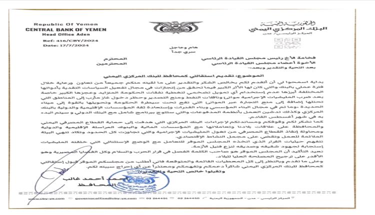 وعلى ما تقدم وبالنظر إلى كل المعطيات القائمة والمتوقعة فاني أطلب من مجلسكم الموقر قبول استقالتي كمحافظ للبنك المركزي اليمني شاكراً دعمكم وتفهمكم ومعتذراً عن أي إحراج سببته لكم.