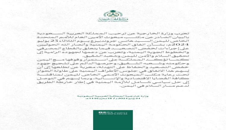أعربت وزارة الخارجية السعودية عن ترحيب المملكة بالبيان الصادر عن مكتب مبعوث الأمين العام للأمم المتحدة الخاص لليمن السيد هانس جروندبيرغ يوم الثلاثاء 23 يوليو 2024م، بشأن اتفاق الحكومة اليمنية وأنصار الله الحوثيين على إجراءات لخفض التصعيد فيما يتعلق بالقطاع المصرفي والخطوط الجوية اليمنية، وعن دعمها لجهوده الرامية إلى تحقيق السلام والأمن لليمن وشعبه الشقيق.