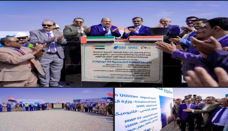 في خطوة تهدف إلى تعزيز مصادر الطاقة المستدامة في محافظة شبوة قام الأخ/ عوض محمد بن الوزير محافظ المحافظة رئيس المجلس المحلي ومدير عام المؤسسة العامة للكهرباء مجيب الشعبي، بوضع حجر الأساس لمشروع الطاقة الشمسية الممول من الأشقاء في دولة الإمارات العربية المتحدة.
