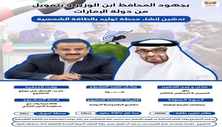 ويأتي وضع حجر الأساس وبدء المشروع تتويجا لجهود المحافظ بن الوزير والممولة من الأشقاء في دولة الإمارات العربية المتحدة ممثلة بسمو الشيخ محمد بن زايد آل نهيان رئيس الدولة لأبناء محافظة شبوة في إطار مساندة الإشقاء في الإمارات لجهود السلطة المحلية بمحافظة شبوة الرامية لتحسين مستوى الخدمات المقدمة للمواطنين، وصولا لتحقيق التنمية المستدامة.