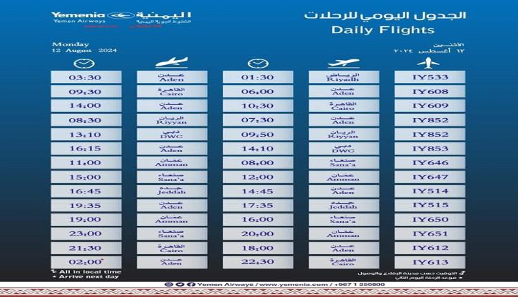 مواعيد اقلاع رحلات طيران اليمنية ليوم غد الاثنين كالتالي: