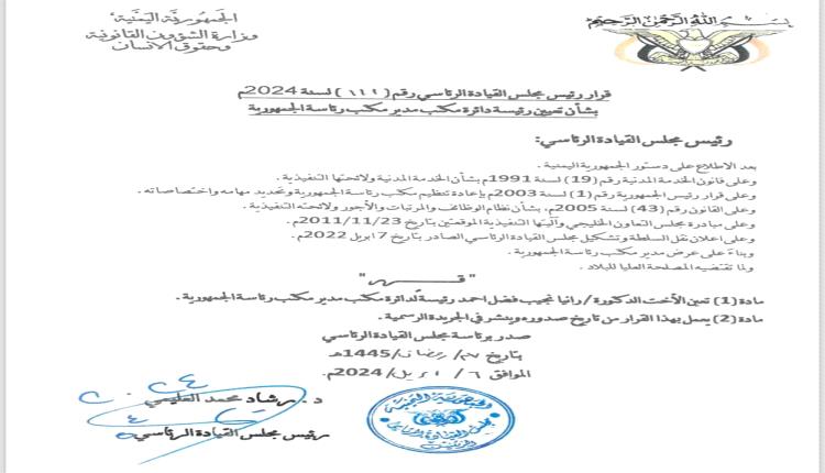 كشفت مصادر خاصة عن انفراد مكتب رئاسة الجمهورية بإصدار قرارات تعيين بتوجيهات رئيس مجلس القيادة الرئاسي رشاد العليمي ودون معرفة أو موافقة أعضاء مجلس القيادة.
