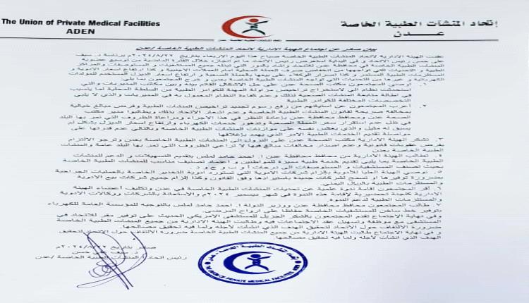 وطالبت الهيئة الادارية جميع المنشآت الطبية الخاصة ضرورة الالتفاف حول الاتحاد لتحقيق الهدف الذي انشأت لأجله ولما فيه تحقيق مصالحها.