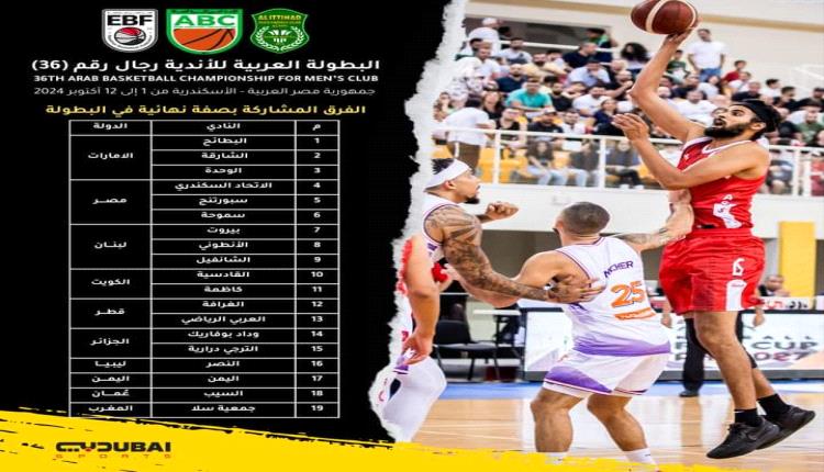 أعلن الاتحاد العربي لكرة السلة رسمياً قائمة الفرق المشاركة في البطولة العربية السادسة والعشرين للأندية رجال التي ستقام في بمدينة الإسكندرية بدبي خلال الفترة 1 – 12 أكتوبر المقبل.