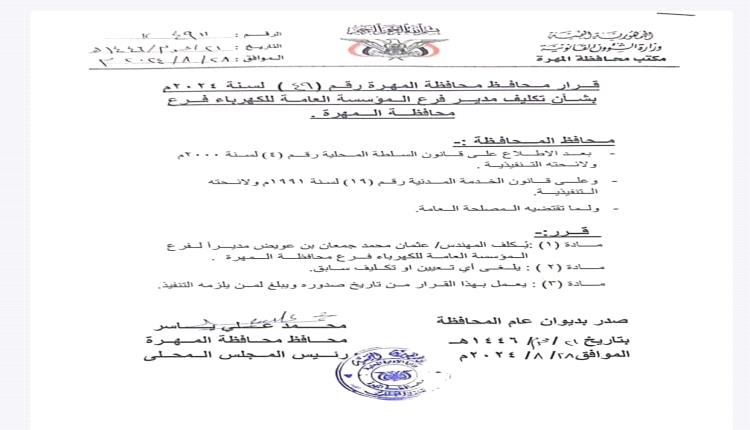 أصدر الأستاذ محمد علي ياسر محافظ محافظة المهرة، اليوم، قرار قضى بتكليف المهندس عثمان محمد جمعان بن عويض مديراً لفرع المؤسسة العامة للكهرباء في محافظة المهرة.
