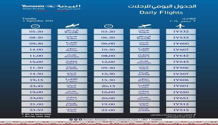 مواعيد اقلاع رحلات طيران اليمنية ليوم غد الثلاثاء كالتالي: